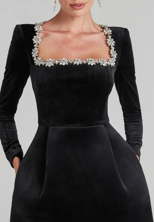 Square Long Sleeves Beaded Velvet Sheath Work Dress