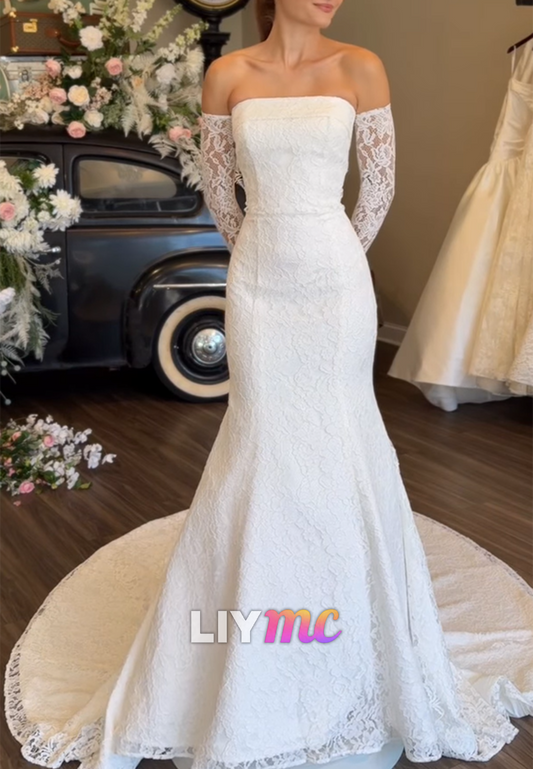 Straight Across Long Sleeves Sleek Mermaid Wedding Dress