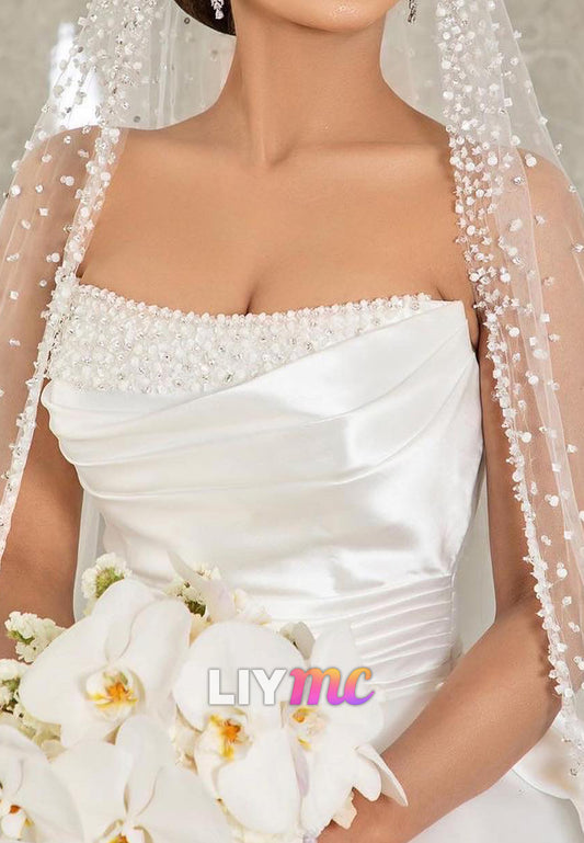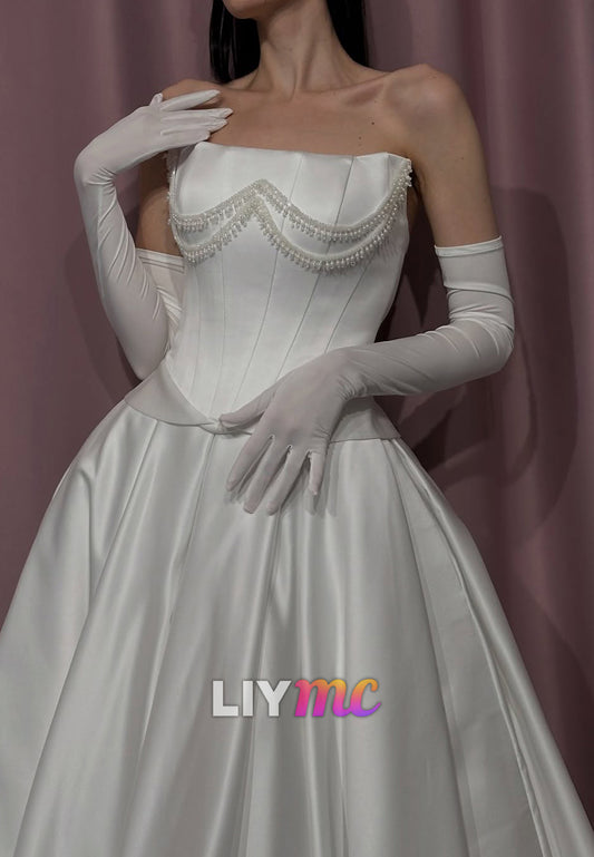Straight Across Pearl Corset Satin A-Line Wedding Dress