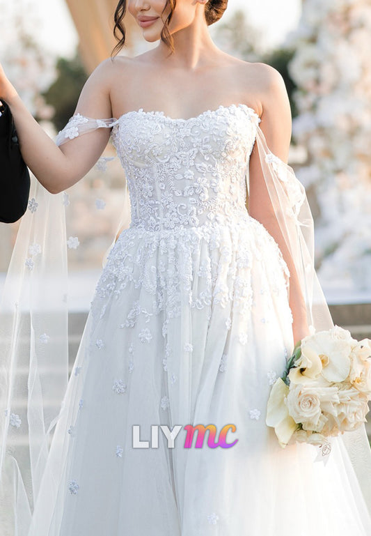 Sweetheart Cap Sleeves Appliques Tulle A-Line Wedding Dress
