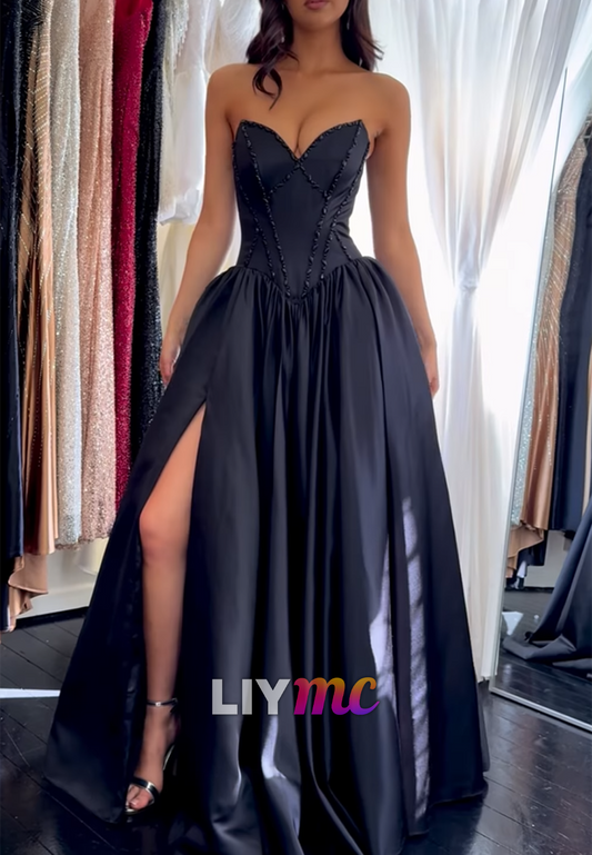Sweetheart Strapless Beaded Side Slit A-Line Prom Dress