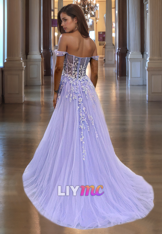 Off-Shoulder Strapless Appliques Sheer Tulle A-Line Prom Dress