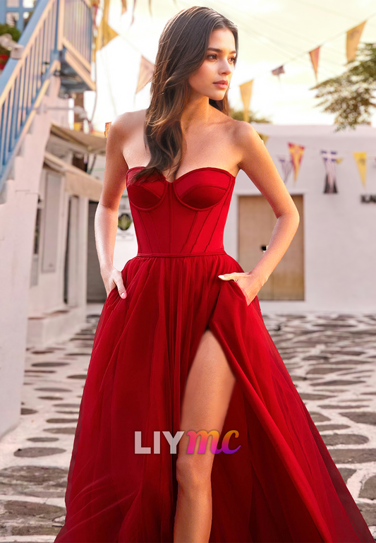 Sweetheart Strapless High Slit Pleated A-Line Prom Dress
