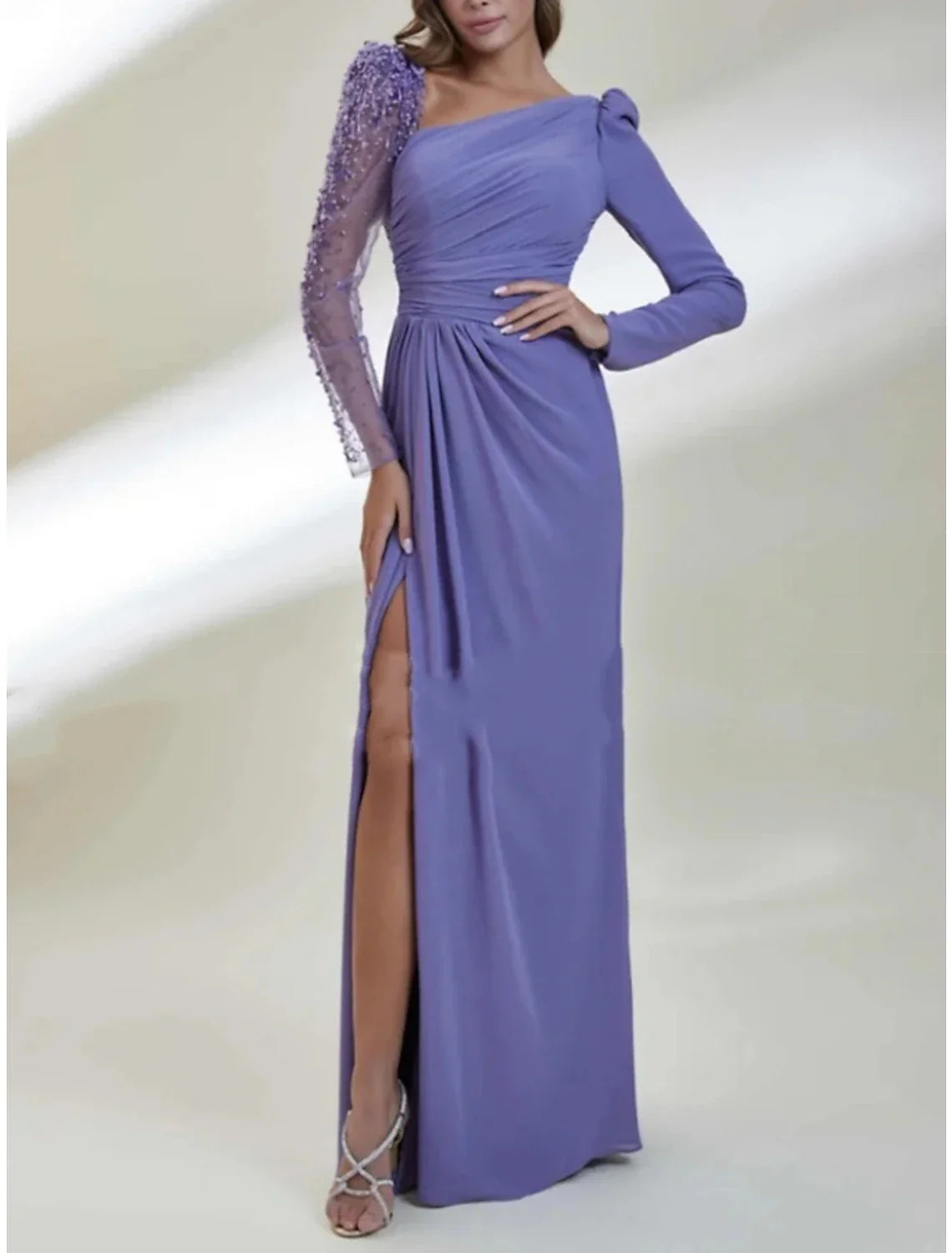 Sheath / Column Evening Gown Elegant Dress Formal Christmas Red Green Dress Sweep / Brush Train Long Sleeve Scoop Neck Stretch Chiffon with Pleats Ruched Sequin x 1;