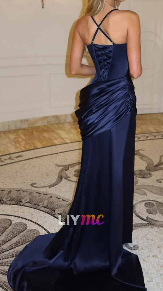 Minimalist Royal Blue Spaghetti-Straps Sleeveless Pleated Mermiad Prom Dress