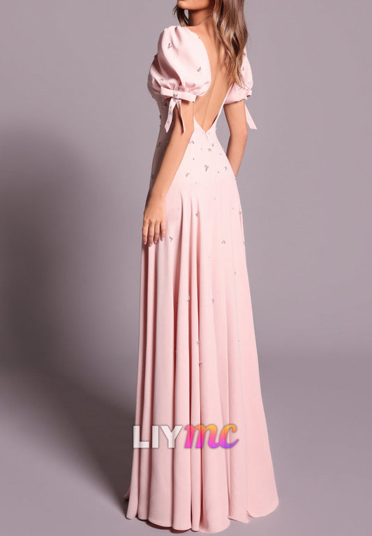 Scoop Short Sleeves Beaded A-Line Prom Dress