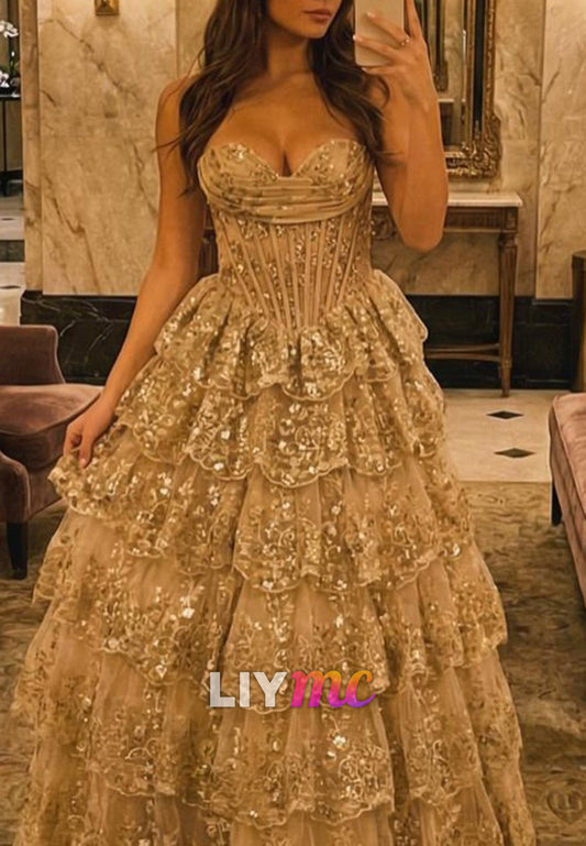 Sweetheart Strapless Sequins Appliques Tiered A-Line Prom Dress