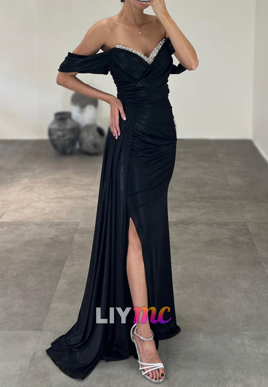V-Neck Strapless Beaded Sidse Slit Pleated Prom Dress Sheath Formal Dress