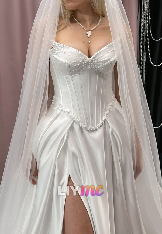 V-Neck Strapless Beaded Side Slit A-Line Satin Wedding Dress