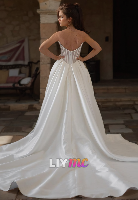 V-Neck Strapless Corset Pleated Satin High Slit A-Line Wedding Dress