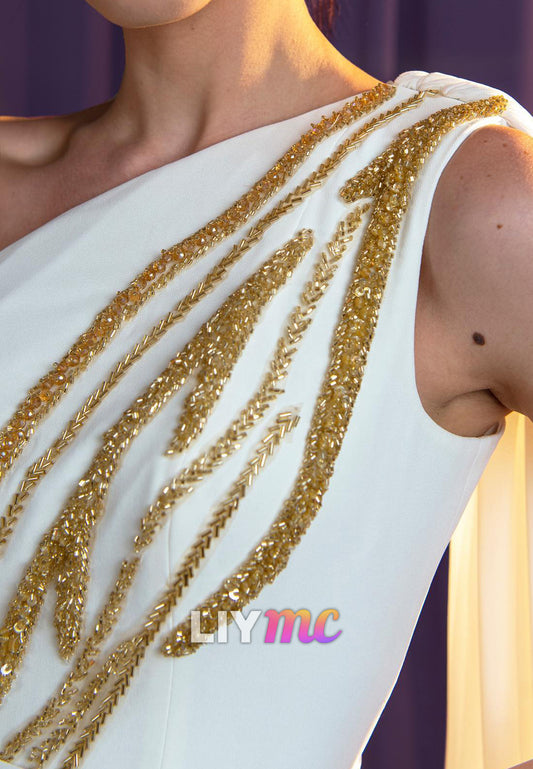 One Shoulder Sleeveless Appliques Sleek Side Slit Sheath Prom Dress