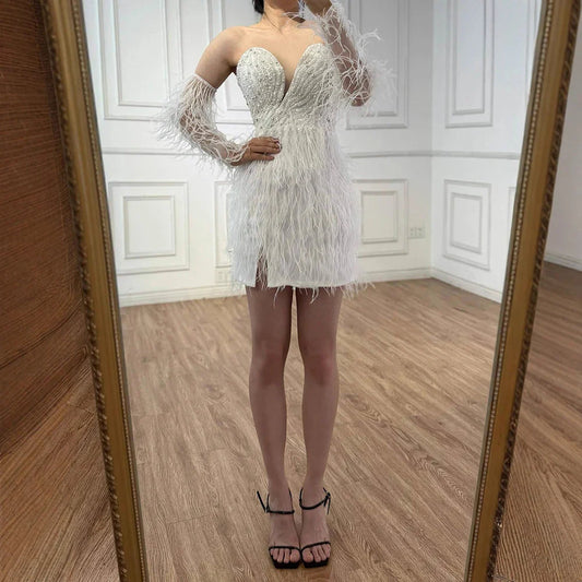 Luxury White Short Beaded Mermaid Feather Cocktail Dress