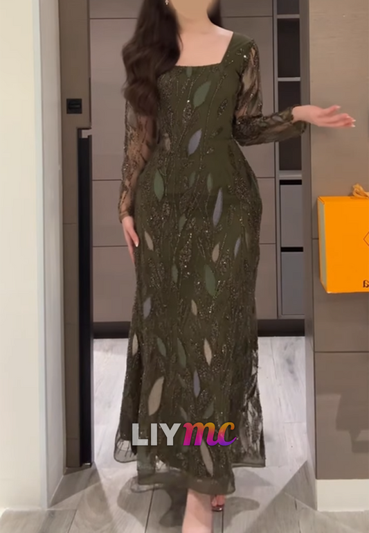 Square Long Sleeves Appliques Beaded Embroidery Sheath Evening Dress