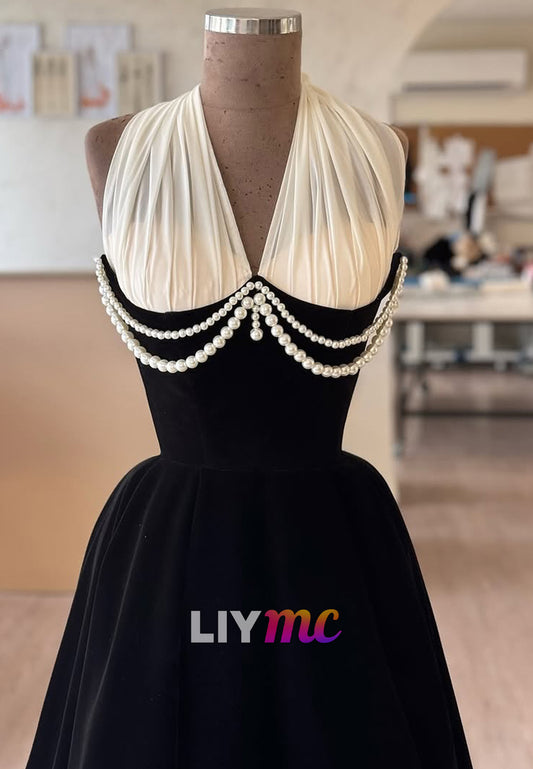 Halter V-Neck Pearl Sleeveless Velvet A-Line Formal Dress