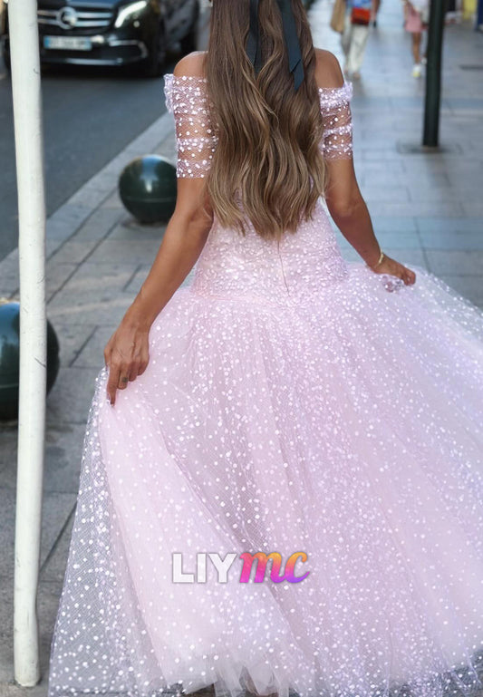 Off-Shoulder Beaded Embroidery Sparkly A-Line Prom Dress