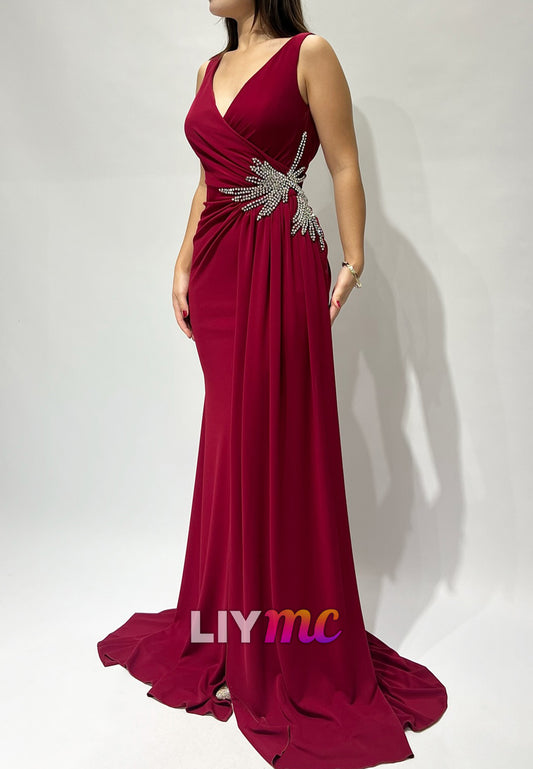 V-Neck Sleeveless Pleated Beaded Sheath Red Evening Dress