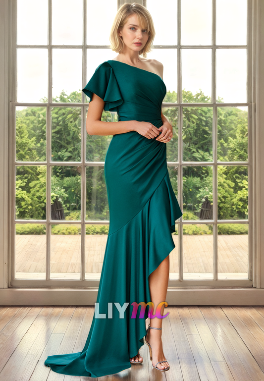 M1314 - Asymmetrical Sleeves Ruched Pleated High Slit Mother of Bride Dress Cocktail Dress