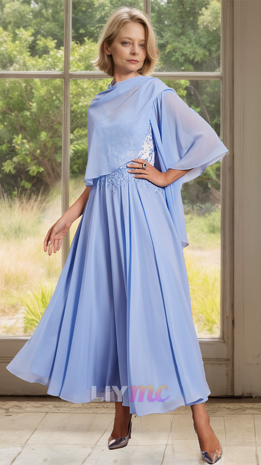 M1079 - Column Mother of the Bride Dress Elegant Jewel Neck Floor Length Chiffon Short Sleeve with Embroidery Appliques