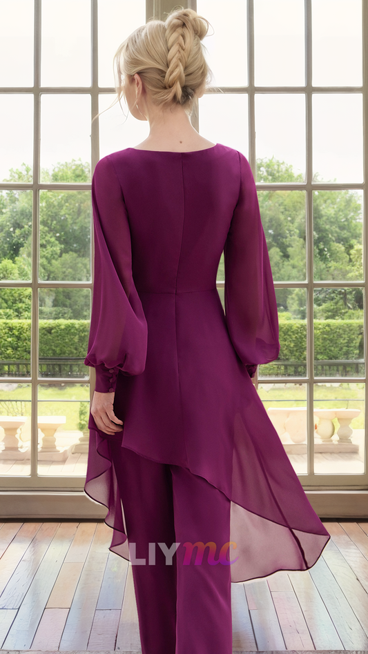 M1182 - V-Neck Jumpsuit Long Sleeves Ruched Chiffon Mother of Bride Dress Cocktail Dress