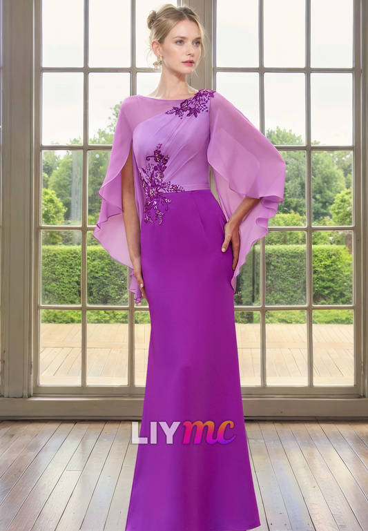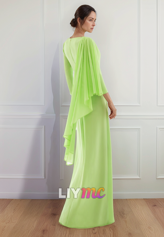 M1081 - Column Mother of the Bride Dress Wedding Jewel Neck Floor Length Chiffon 34 Length Sleeve with Appliques