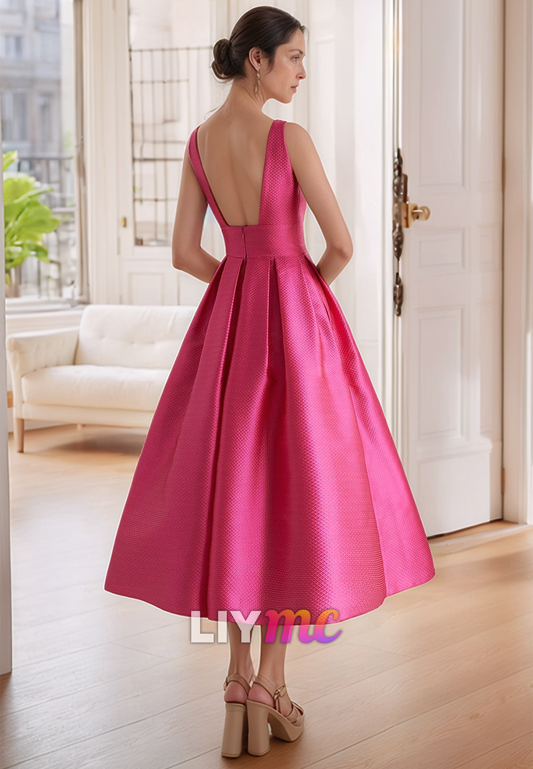 M1293 - V-Neck Sleeveless Sleek Satin Pleated A-Line Mother of Bride Dress Cocktail Dress
