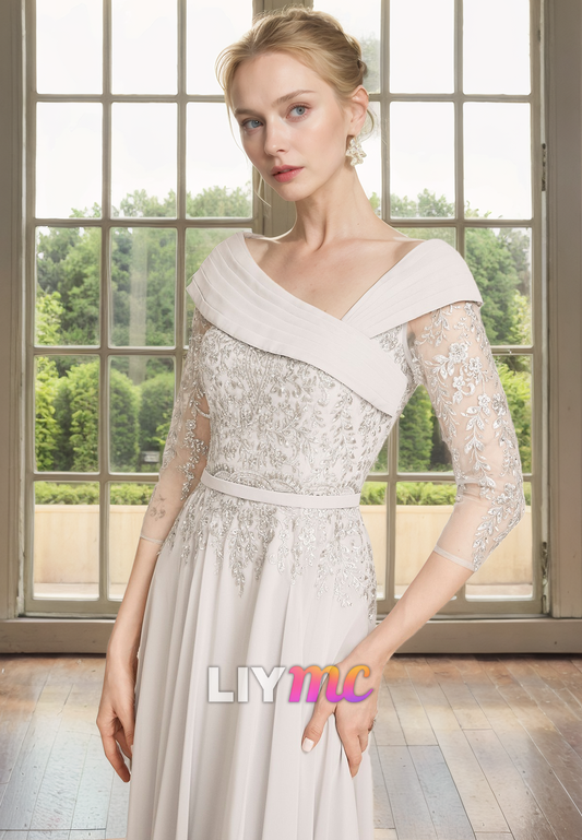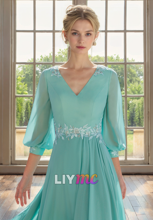 M1162 - V-Neck Half Sleeves Appliques Pleated A-Line Chiffon Mother of Bride Wedding Guest Dress