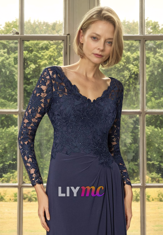 M1175 - V-Neck Long Sleeves Appliques Mermaid Mother of Bride Wedding Guest Dress