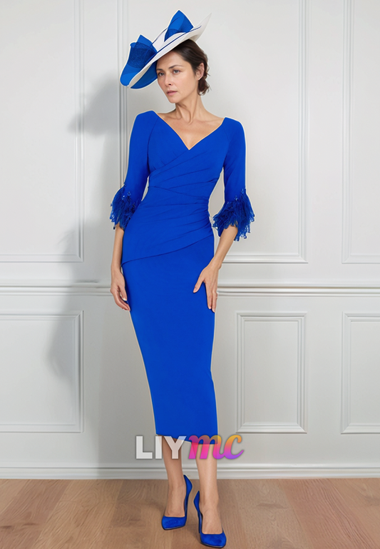 V-Neck Long Sleeves Ruffled Sheath Mother of Bride Dress Evening Dress