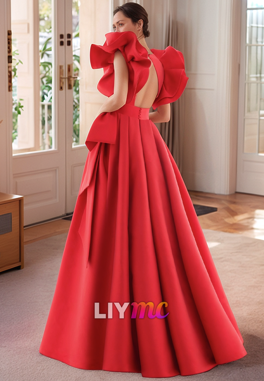 V-Neck Ruffled Pleated Satin Floor-Evening Dress Length A-Line Mother of Bride Dress