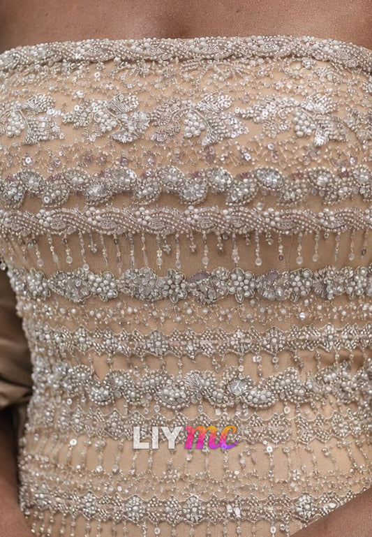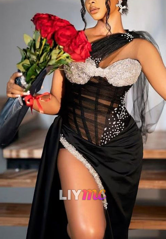One Shoulder Beaded Side Slit Sheath Prom Dress