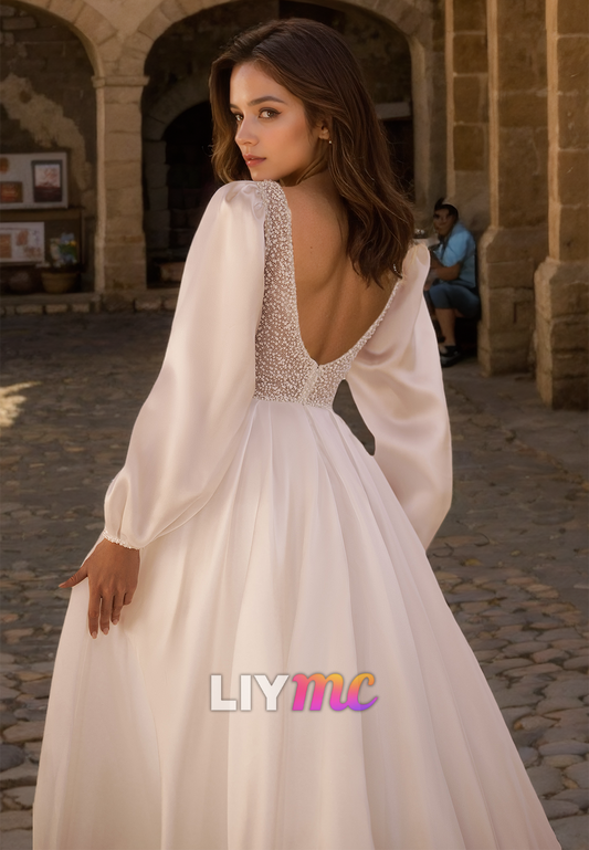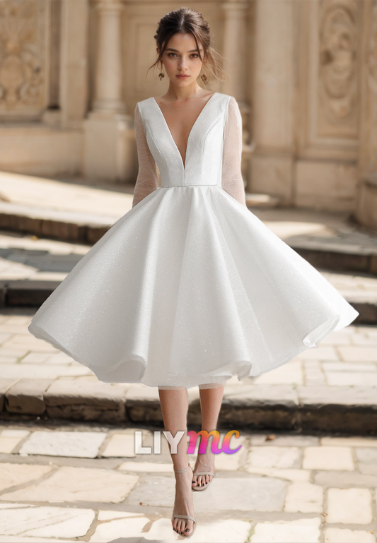 V-Neck Long Sleeves Pleated A-Line Sparkly Wedding Dress