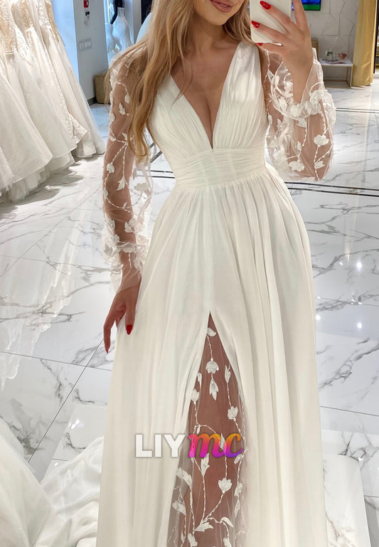V-Neck Long Sleeves Pleated High Slit A-Line Beach Wedding Dress