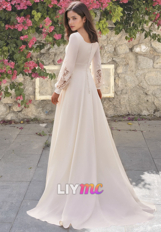 V-Neck Long Sleeves Pleated Appliques A-Line Wedding Dress