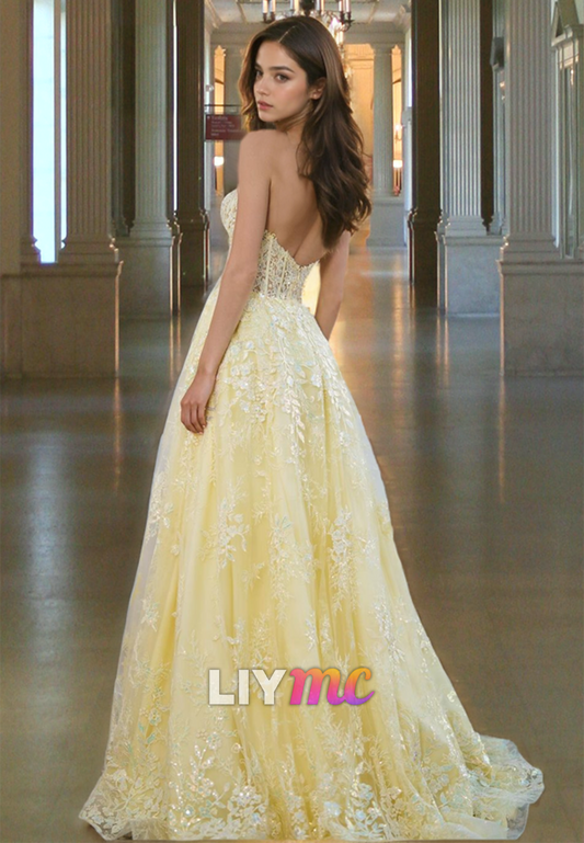 Sweetheart Sleeveless Appliques Tulle High Slit A-Line Prom Dress