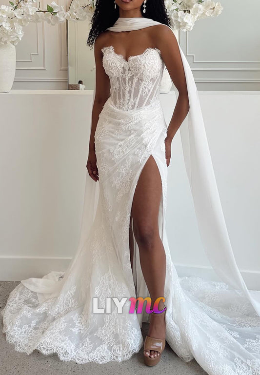 Sweetheart Sleeveless Lace Appliques Side Slit Sheath Wedding Dress