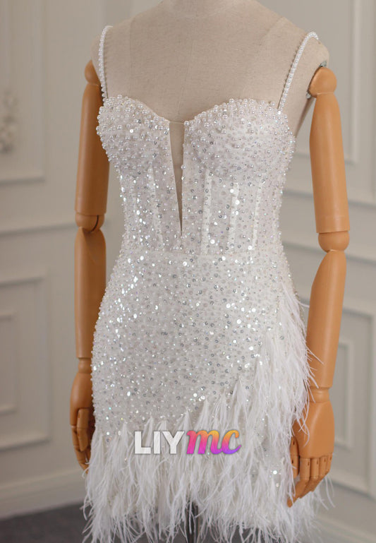 Sweetheart Spaghetti Straps Pearl Sequins Feather Short Wedding Dress