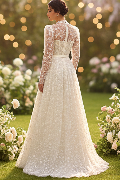 High Neck Appliques Beaded Embroidery A-Line Wedding Dress