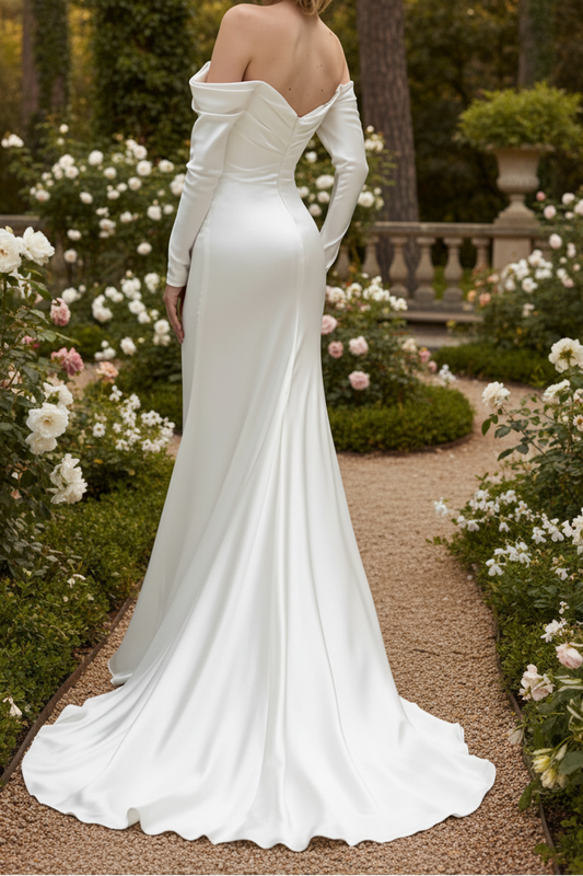 Elegant Long Sleeve Satin Mermaid Wedding Dress with Draped Neckline