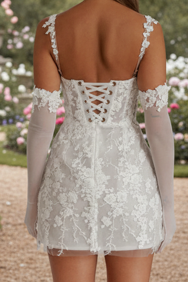 Floral Lace Mini Wedding Dress with Spaghetti Straps and Corset Back