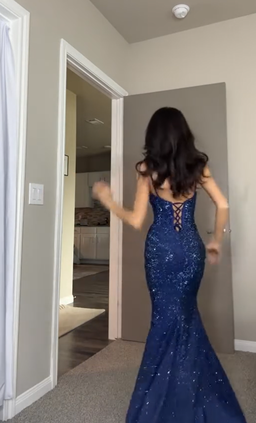 Sparkling Dark Blue Spaghetti-Straps Mermaid Sleeveless Split Prom Dress