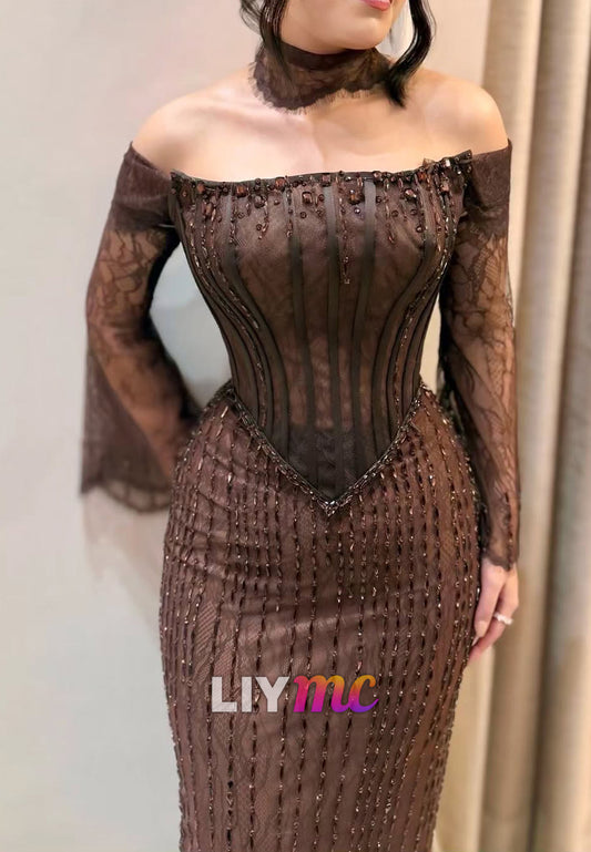 Off-Shoulder Long Sleeves Beaded Lace Appliques Mermaid Evening Dress