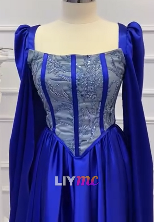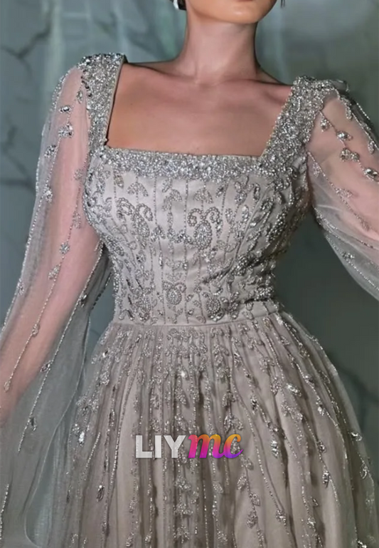 Square Long Sleeves Beaded Embroidery Sparkly A-Line Prom Dress