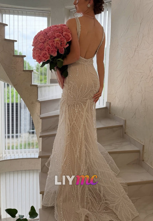 Square Straps Beaded Embroidery Mermaid Sparkly Evening Dress