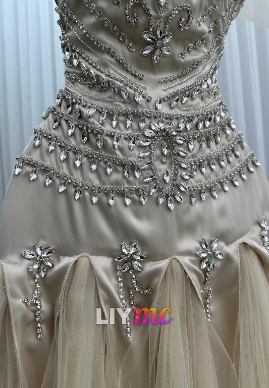 LP598 - Illusion One Shoulder Beaded Pleated Satin Sheath Long Prom Evening Dress