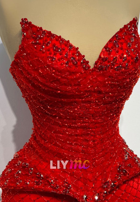 V-Neck Strapless Beaded Sparkly Mermaid Red Prom Dress