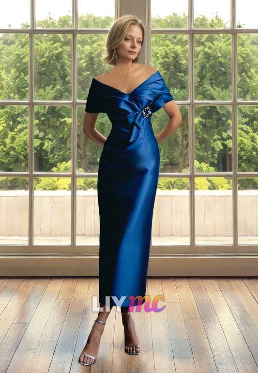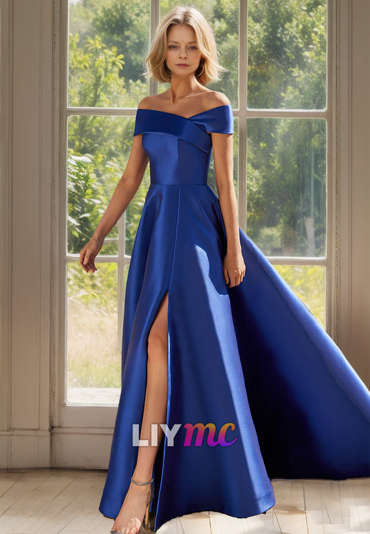 Off-Shoulder Cap Sleeves Side Slit Sleek Satin A-Line Mother of Bride Dress