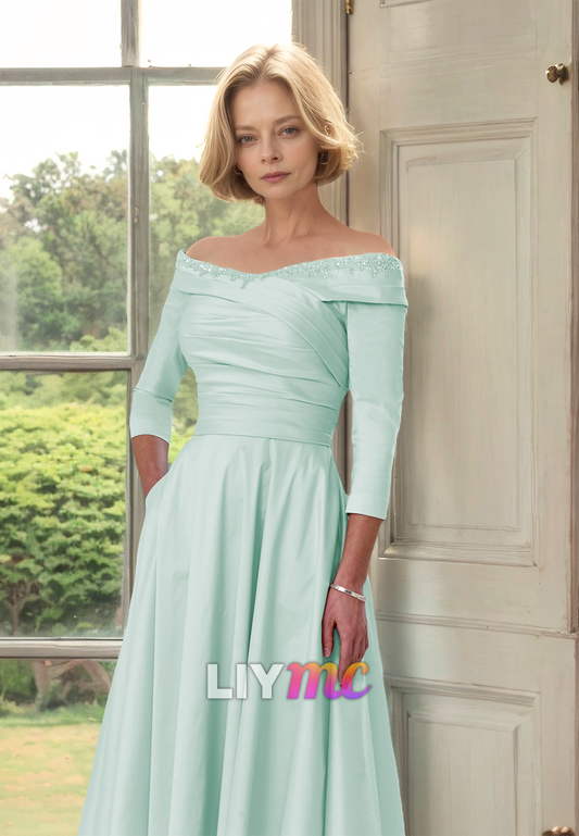 Off-Shoulder Long Sleeves Pleated Satin A-Line Mother of Bride Dress