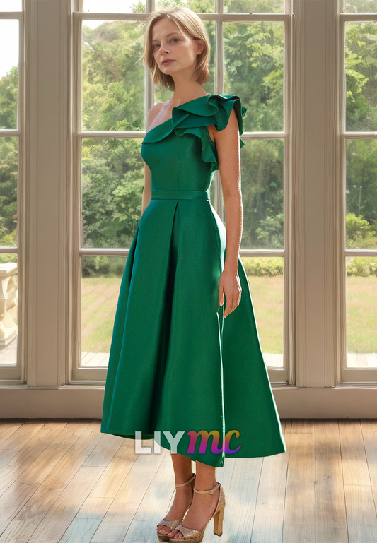 One Shoulder Ruffled Sleek Pleated Satin A-Line Mother of Bride Dress