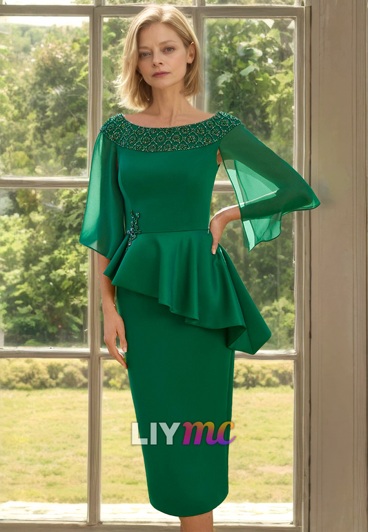 Scoop Long Sleeves Ruffled Sheath Beaded Sheath Knee-Length Mother of Bride Dress