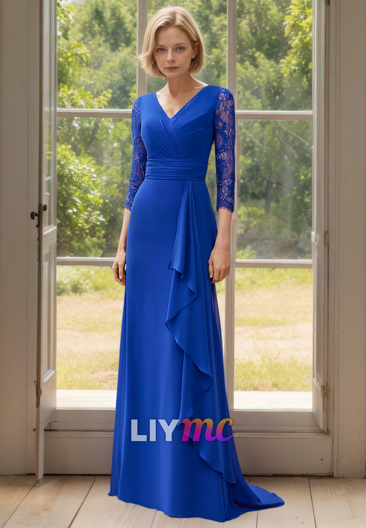 V-Neck Long Lace Appliques Sleeves Ruffled Sheath Mother of Bride Dress